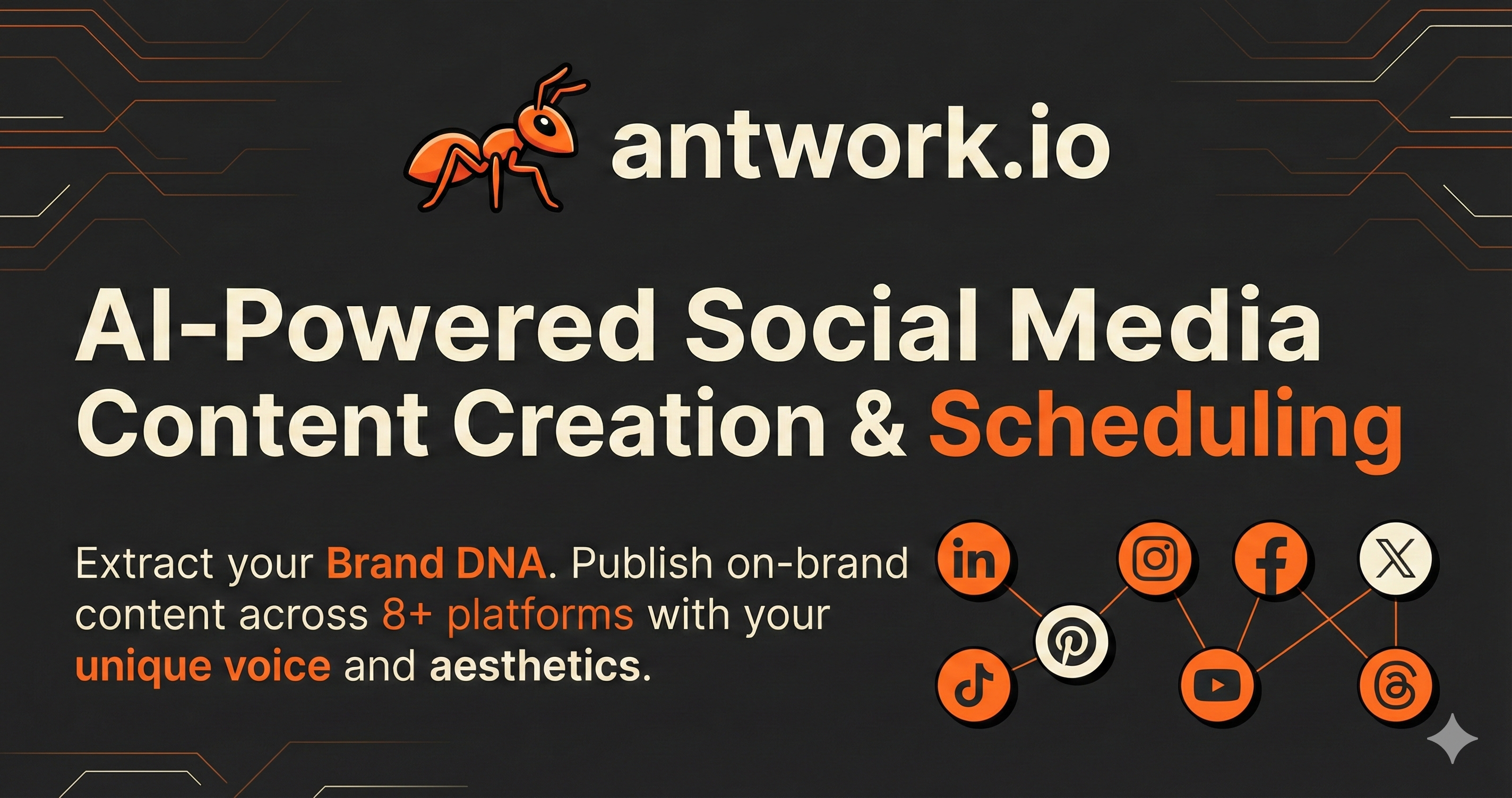 Antwork is an AI social media agent that learns your brand identity: voice, tone, and audience from your website and connected social profiles in under 30 seconds. It drafts on-brand posts, adapts content per platform, and lets you schedule or auto-publish across LinkedIn, X, Instagram, Facebook, YouTube, TikTok, Threads, and Pinterest. Key features include: - An AI chat agent that knows your brand inside out: draft posts, plan content calendars, search for trends, generate on-brand images, and analyze performance, all through conversation. - The compose workflow supports drafts, scheduling, media uploads, per-platform text variants, and a visual content calendar. - Multi-brand workspaces let agencies manage multiple clients with separate brand profiles, team roles, and approval flows. Whether you're a creator, agency, or startup: Antwork replaces disconnected tools with one assistant that actually sounds like you, not a robot.