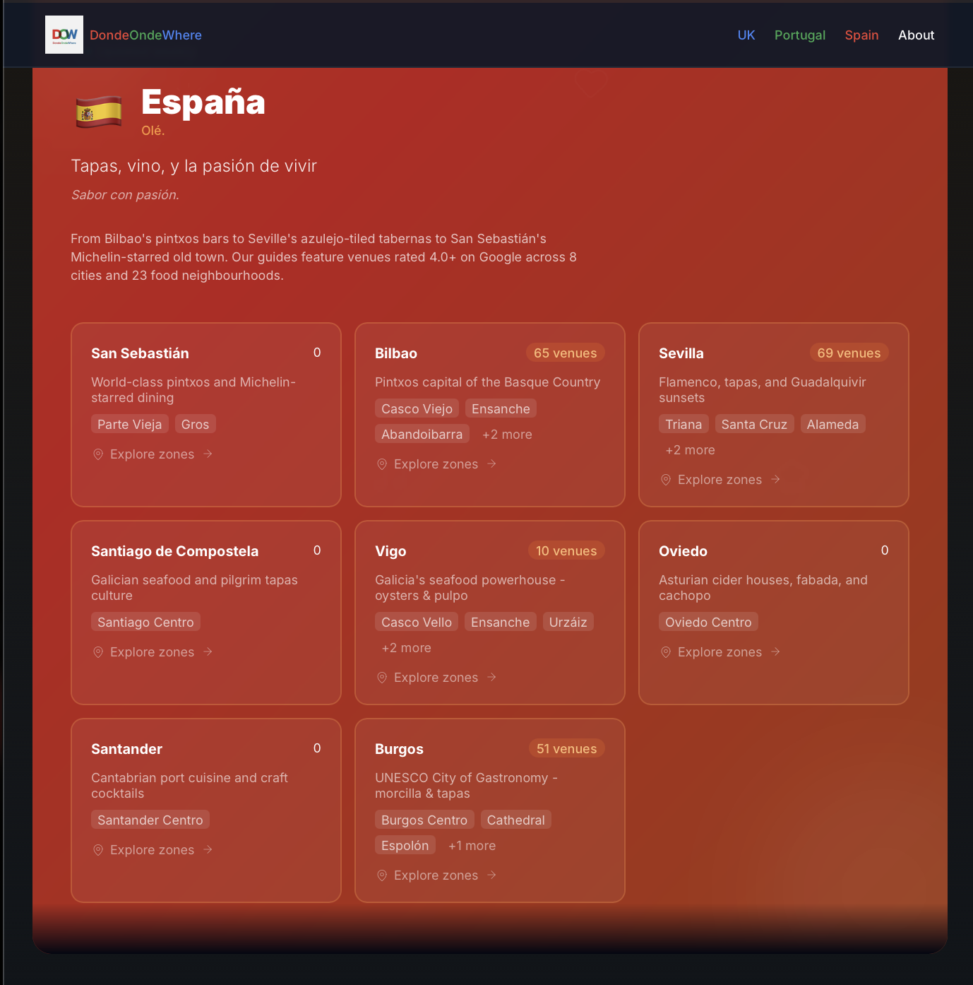 donde-onde-where surfaces Europe's hidden restaurant and bar gems through real customer voices. We aggregate, quote, and rank—never editorialize. Hot Lists from 49 zones across UK, Portugal, and Spain, updated monthly. No chains, no paid placements, no opinions. Just data-driven discovery of the independent venues locals genuinely love. The customers speak. We listen.