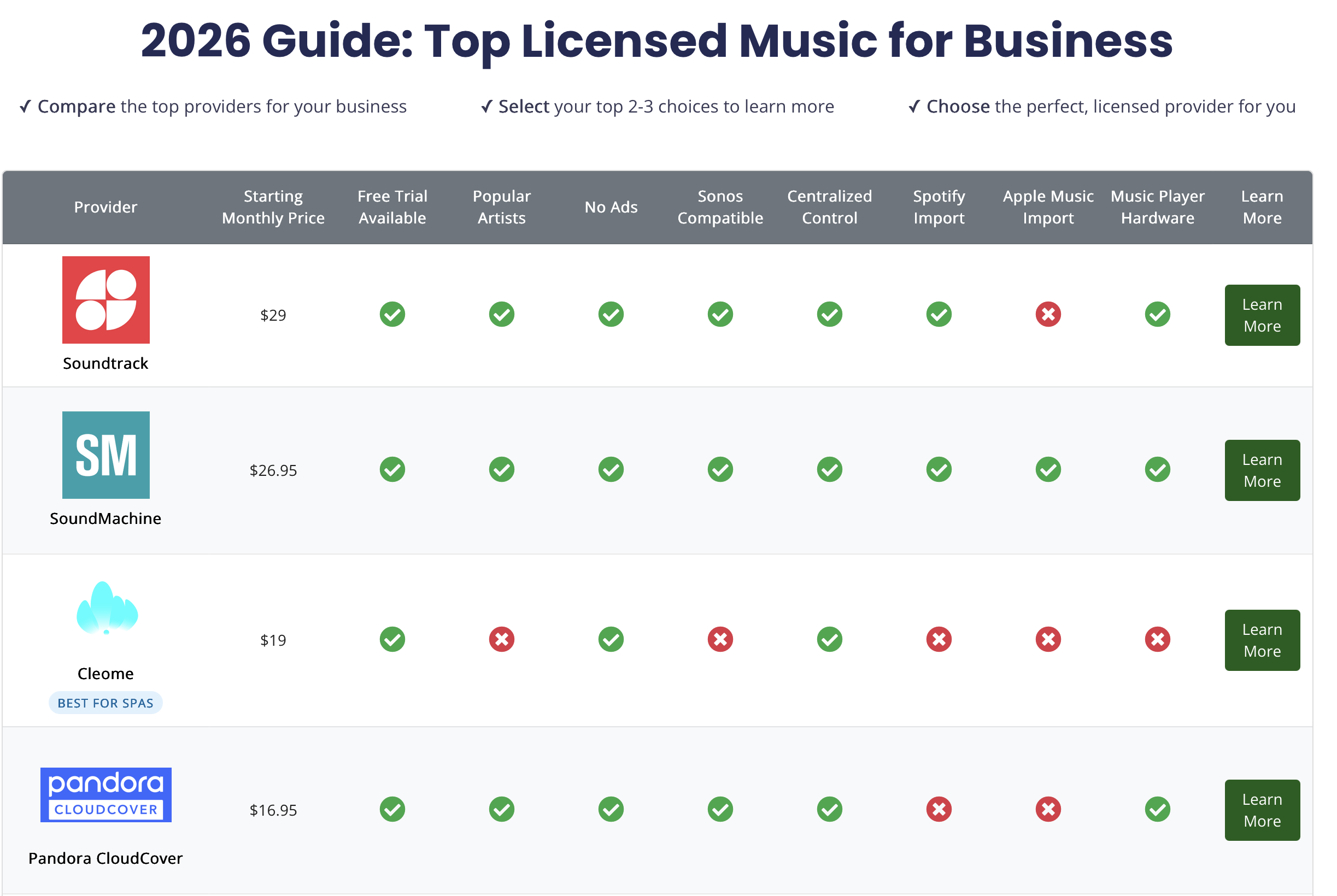 Compare the top providers of fully licensed music for business. Find the right features, playback options, and pricing for your small business.