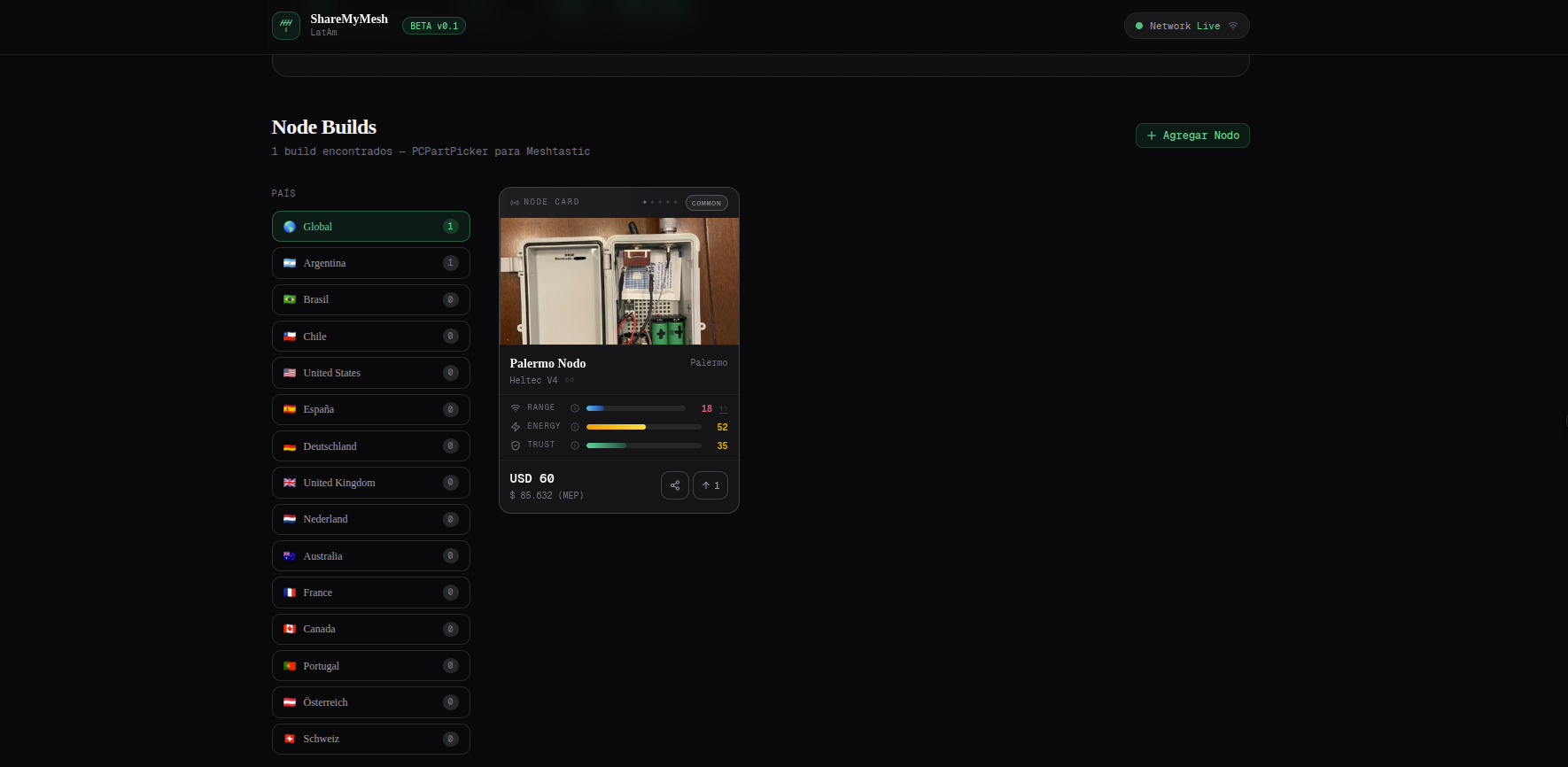 ShareMyMesh is a specialized tool for the Meshtastic community that works like a "PC Part Picker" for LoRa nodes. It allows users to document their specific hardware setups—including boards (RAK, Heltec), antennas, and solar configurations—to calculate performance benchmarks. The platform generates collectible "Node Cards" with dynamic stats for Range, Energy efficiency, and Community Trust. Beyond cataloging, it features a geolocated check-in system that allows users to physically verify node presence via GPS, helping to validate network coverage and eliminate "ghost nodes" from the map.