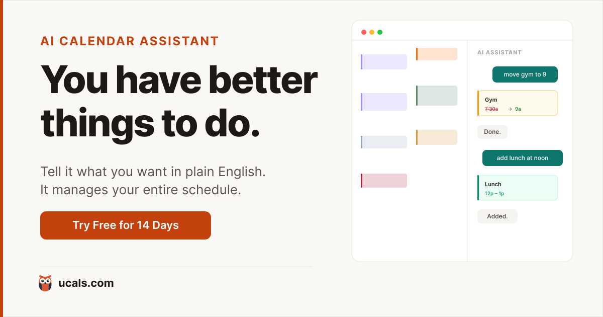 AI calendar assistant that manages your entire schedule through conversation. Work, meals, exercise, travel, sleep. $15/month. 14 days free.