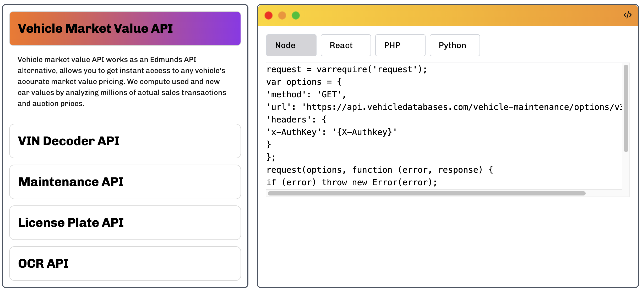 Unlock instant vehicle insights—decode VINs, access specs, history & market data via powerful APIs and backend services for developers and analysts. Rated #1 for VIN Decoding API & Market Value APIs.